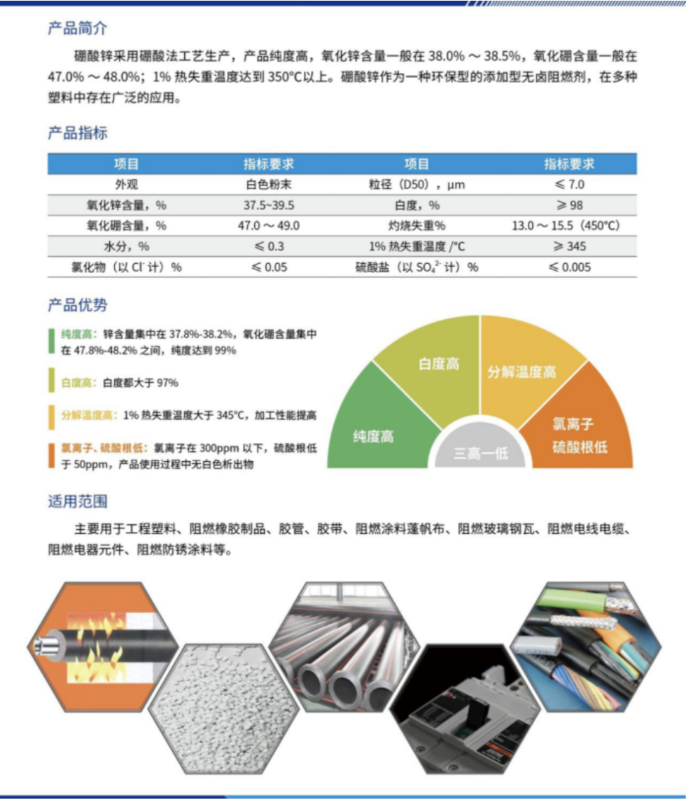 簡述: 硼酸鋅采用硼酸法工藝上產(chǎn),產(chǎn)品純度高,氧化鋅含量一般在38%-38.5%,氧化硼含量一般在47¥-48%;1%熱失重溫度達到350℃以上。硼酸鋅作為一種環(huán)保型的添加型無鹵阻燃劑,在很多塑料中存在廣泛的應(yīng)用